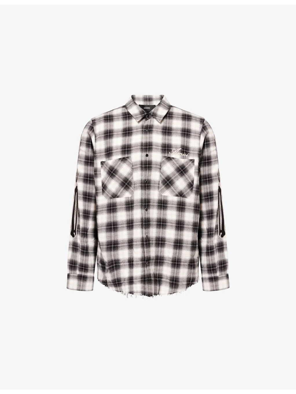 PRODUCT DETAILS - AMIRI cotton overshirt - 100% cotton; embellishments 100% polyester - Popper fastening at front - Spread collar - Buttoned cuffs - Relaxed fit, collar, long sleeves, brand embroidery and patch pocket at front, straight yoke at back, all-over check print, all-over flannel texture - Dry clean - Made in Italy - Size medium: length 28in / 72cm, chest 44in / 112cm - Model is 6ft 2in/1.88m and wears a size medium - Lightweight, stretchy Ref: R04548560