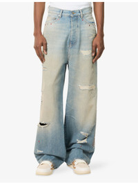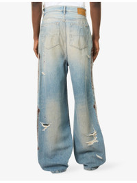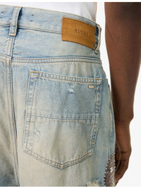 PRODUCT DETAILS - AMIRI denim jeans - 100% cotton - Button and button-fly fastening at front - Baggy fit, mid-rise, straight leg, belt loops, classic five pockets, faded wash, all-over embellished detailing, brand patch at back, distressed finish - Specialist dry clean only - Made in Italy - Size UK 30: rise 15.3in / 39cm, inside leg 31.1in / 79cm, leg opening 22in / 56cm - Model is 6ft 2in/1.88m and wears a size UK 30 - Midweight, non-stretch Ref: R04548569
