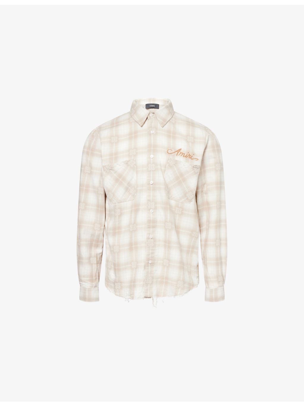 PRODUCT DETAILS - AMIRI cotton shirt - 100% cotton - Exposed button fastening at front - Pointed collar, long sleeves, buttoned cuffs, one patch pocket at chest, silver-toned branded plaque at pocket, embroidered brand text at chest, embroidered bandana-patch at back, curved frayed hem - Dry clean - Made in Italy - Size medium: length 29.5in / 75cm, chest 43.3in / 110cm - Model is 6ft 2in/1.88m and wears a size medium - Lightweight, non-stretch Ref: R04481573
