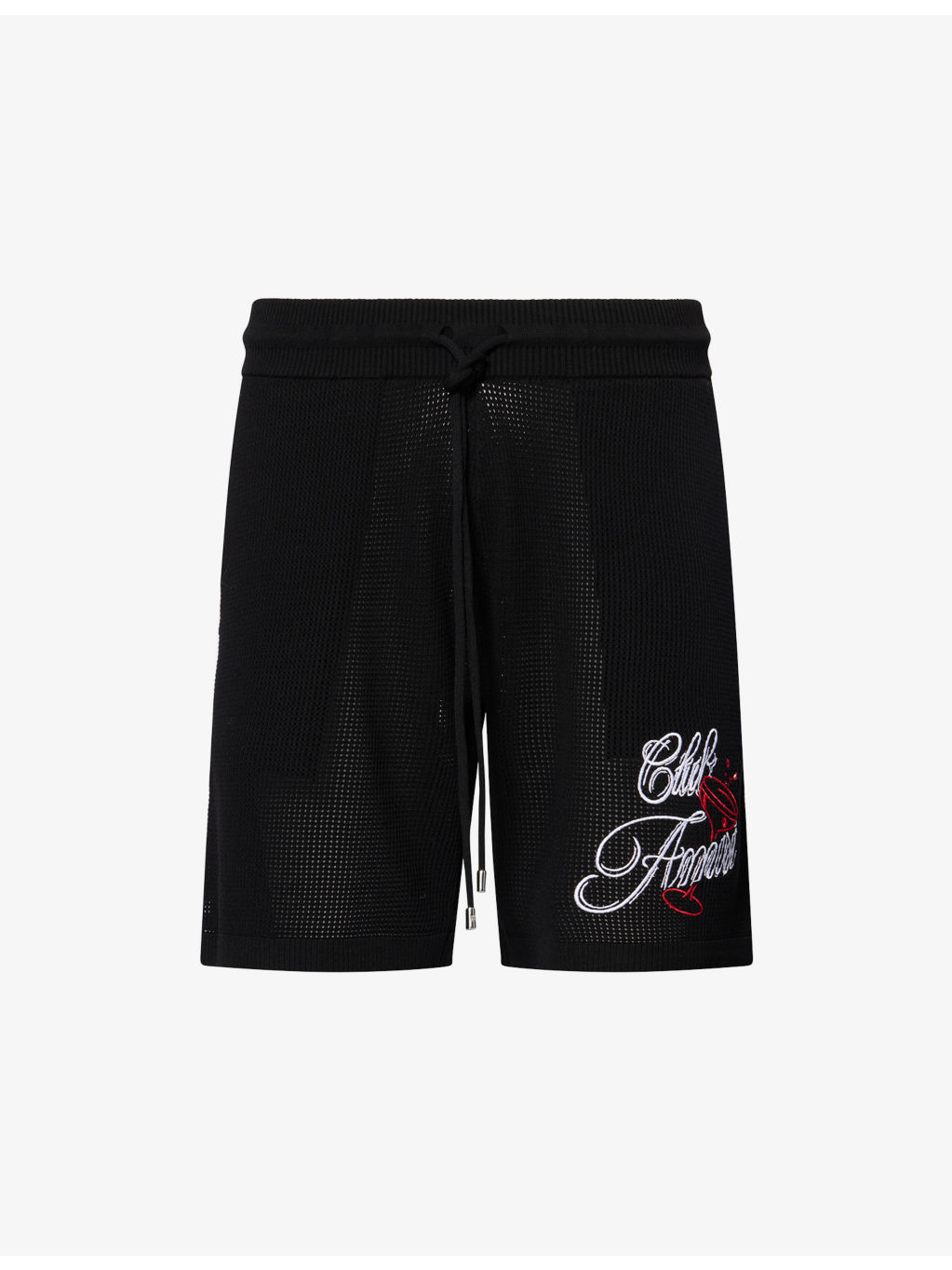 PRODUCT DETAILS - AMIRI woven shorts - 70% viscose, 30% polyester - Relaxed fit, mid-rise, drawstring elasticated waistband, two slip pockets and brand embroidery at front, all-over crochet texture - Hand wash cold - Made in Italy - Model is 6ft 2in/1.88m and wears a size medium - Midweight, stretchy Ref: R04521056