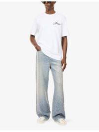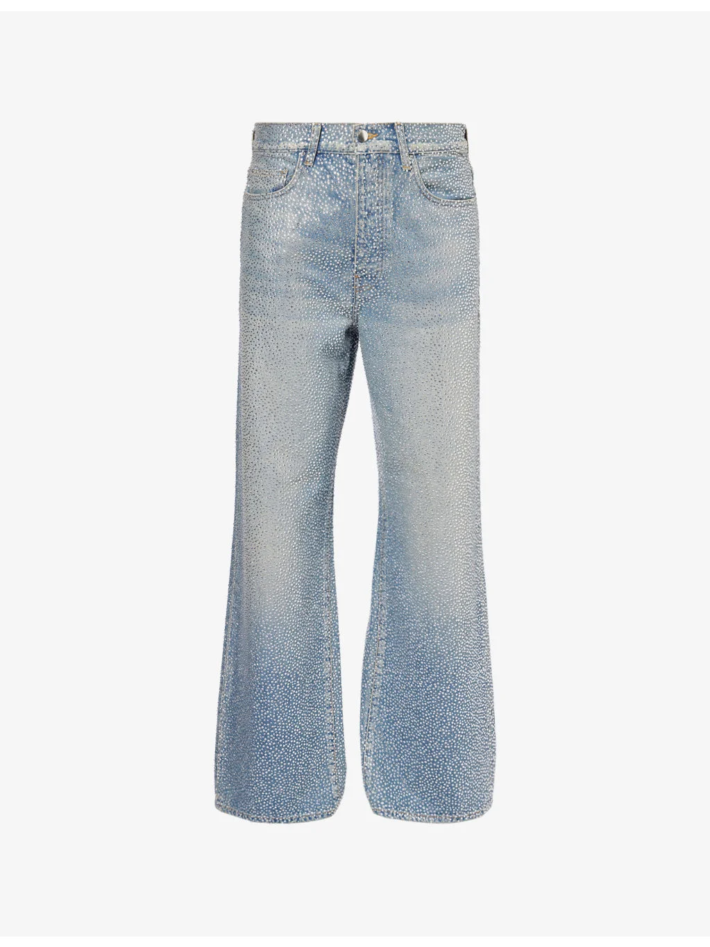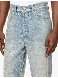 PRODUCT DETAILS - AMIRI denim jeans - 92% cotton, 6% elastomultiester, 2% elastane; trims 100% glass - Regular fit, mid-rise, straight leg, belt loops, classic five pockets, faded wash, all-over embellished detailing - Made in USA - Size UK 30: rise 13.3in / 34cm, inside leg 31.4in / 80cm, leg opening 21.2in / 54cm - Model is 6ft 2in/1.88m and wears a size UK 30 - Midweight, non-stretch Ref: R04548570