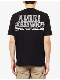 PRODUCT DETAILS - AMIRI cotton-jersey T-shirt - 100% cotton; trims 100% cotton - Relaxed fit, ribbed crewneck, short sleeves, brand and text print at front and back - Dry clean - Made in Italy - Model is 6ft 2in/1.88m and wears a size medium - Lightweight, stretchy Ref: R04548529
