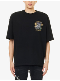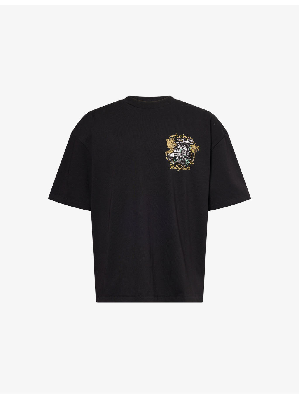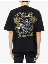 PRODUCT DETAILS - AMIRI cotton-jersey T-shirt - 100% cotton; trims 95% cotton, 5% elastane - Oversized, ribbed crewneck, short sleeves, brand and graphic print at front and back - Dry clean - Made in Italy - Model is 6ft 2in/1.88m and wears a size medium - Lightweight, stretchy Ref: R04521047