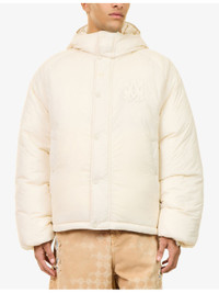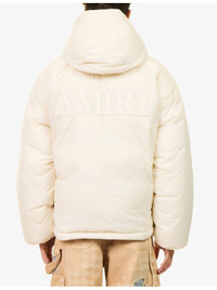PRODUCT DETAILS - AMIRI shell-down jacket - 100% polyamide; lining 100% polyamide - Concealed zip fastening and exposed press-stud fastening at front - Elasticated fixed hood, long sleeves, elasticated cuffs, two slanted welt pockets at front, embroidered brand patch at chest, padded, drawstring hem - Sponge clean - Made in Romania - Size medium: length 28.3in / 72cm, chest 47.2in / 120cm - Model is 6ft 2in/1.88m and wears a size medium - Midweight, non-stretch Ref: R04539508