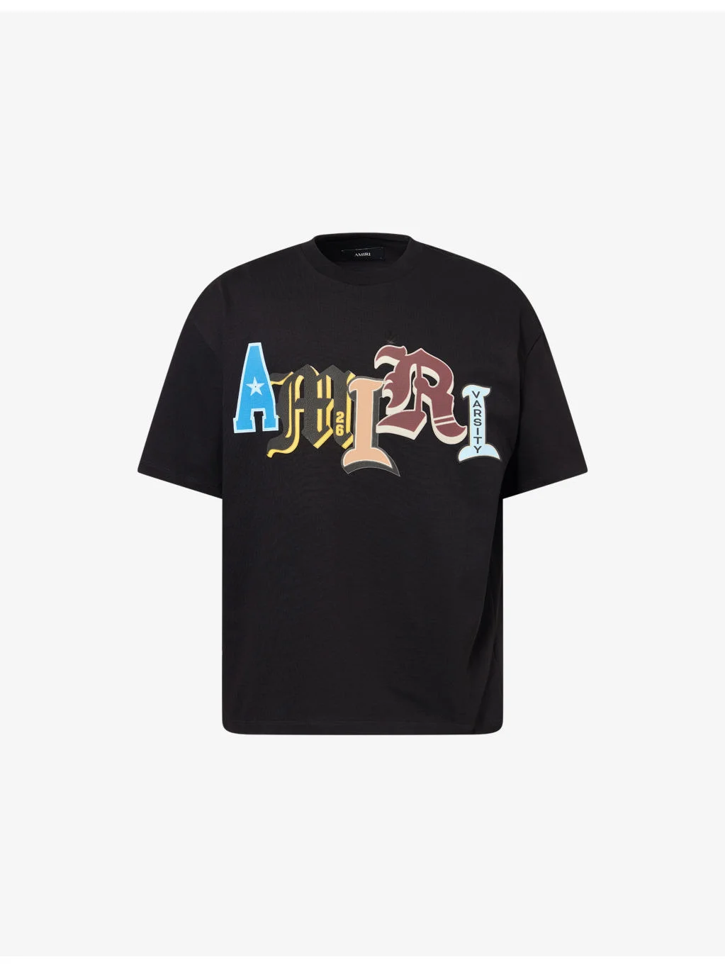 PRODUCT DETAILS - AMIRI cotton-jersey T-shirt - 100% cotton; trims 95% cotton, 5% elastane - Oversized, ribbed crewneck, short sleeves, brand patch and text print at front - Dry clean - Made in Italy - Model is 6ft 2in/1.88m and wears a size medium - Lightweight, stretchy Ref: R04548538
