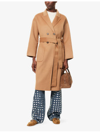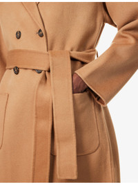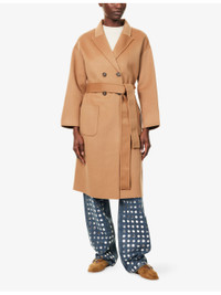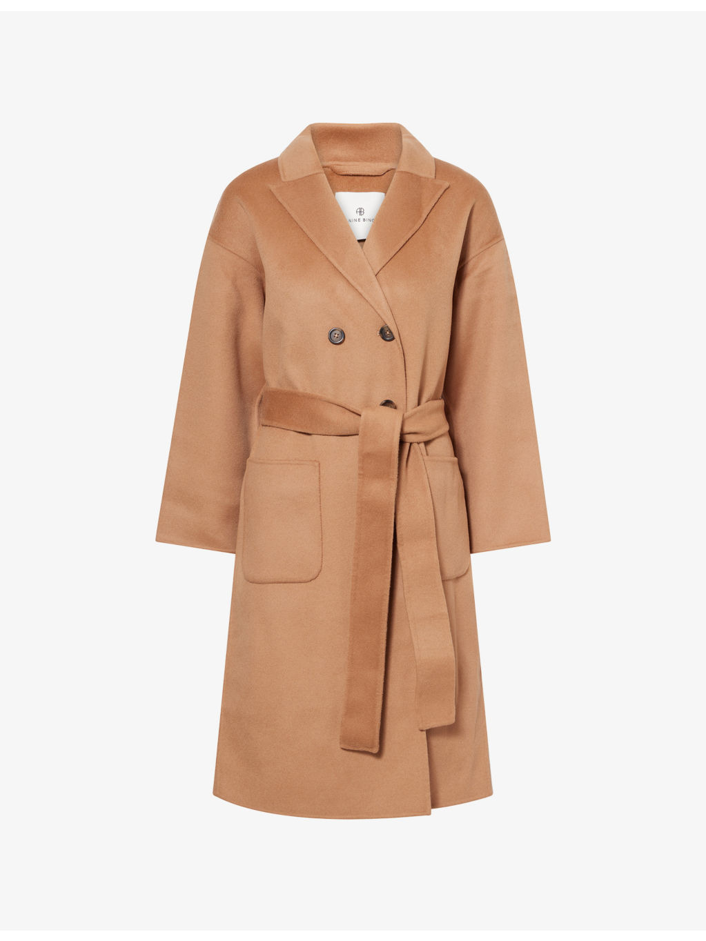 PRODUCT DETAILS - ANINE BING wool and cashmere coat - 90% wool, 10% cashmere - Exposed button fastening at front - Relaxed fit, double-breasted, peak lapels, long sleeves, two patch pockets at front, belt loops, detachable belt, unlined - Dry clean - True to size - Size small: length 42in / 107cm - Model is 5ft 10in/1.78m and wears a size medium - Midweight, stretchy Ref: R04495358