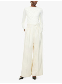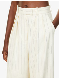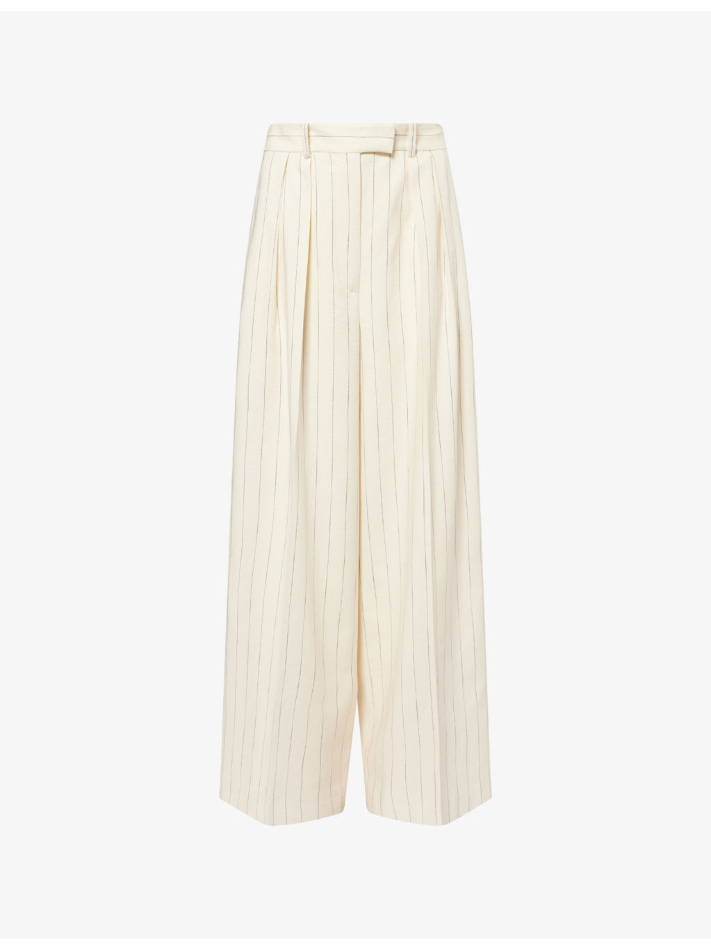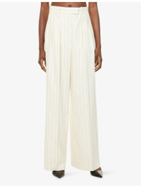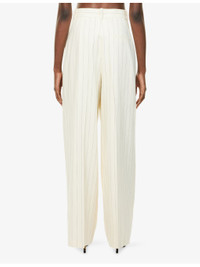 PRODUCT DETAILS - ANINE BING stretch-woven trousers - 91% viscose, 8% polyester, 1% elastane; lining 100% polyester - Concealed button, hook-and-eye and zip-fly fastening at front - Relaxed fit, high-rise, wide leg, belt loops, two slip pockets and pleated at front, welt pocket at back, all-over striped print, fully lined - Dry clean - Made in Portugal - True to size - Size UK 8: rise 15in / 39cm, inside leg 31in / 80cm, leg opening 28in / 71cm - Model is 5ft 10in/1.78m and wears a size UK 8 - Midweight, stretchy Ref: R04495308