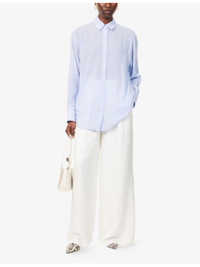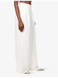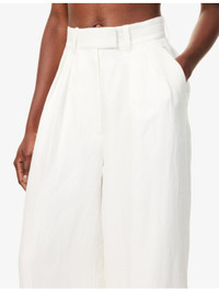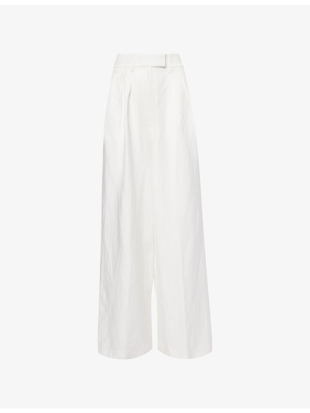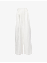 PRODUCT DETAILS - ANINE BING woven trousers - 69% rayon, 31% linen; lining 100% polyester - Concealed button, hook-and-eye and zip-fly fastening at front - Relaxed fit, high-rise, wide leg, belt loops, two slip pockets and pleated at front, two jetted pockets at back - Machine wash at 30°C - True to size - Size UK 8: rise 15in / 39cm, inside leg 32in / 81cm, leg opening 28in / 71cm - Model is 5ft 10in/1.78m and wears a size UK 8 - Lightweight, stretchy Ref: R04495328