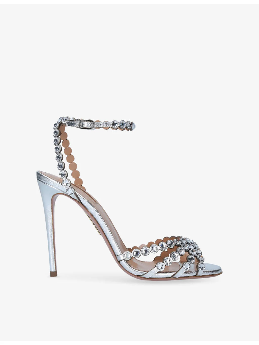 PRODUCT DETAILS - Aquazzura leather heeled sandals - 100% leather - Ankle-buckle fastening - Round open toe, metallic finish, stiletto heel, all-over crystal embellishment, ankle strap, Pineapple logo-embossed sole - Heel height 105mm / 4.13in - Specialist leather clean - Made in Italy - Upper: 100% leather - Lining: 100% leather - Sole: 100% leather Ref: R04302092