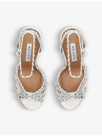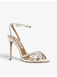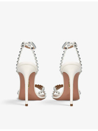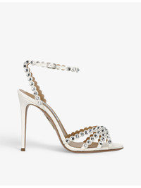 PRODUCT DETAILS - Aquazzura leather heeled sandals - Leather - Ankle-buckle fastening - Round open toe, metallic finish, stiletto heel, all-over crystal embellishment, ankle strap, Pineapple logo-embossed sole - Heel height 4.13” - Specialist leather clean - Made in Italy - Upper: leather - Lining: leather - Sole: leather Ref: R04099662