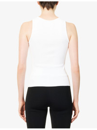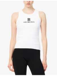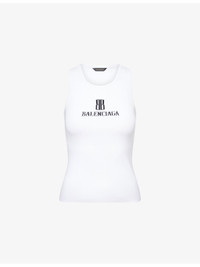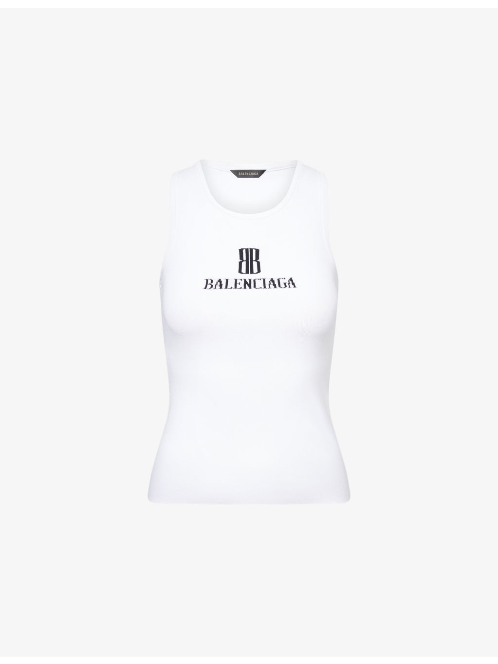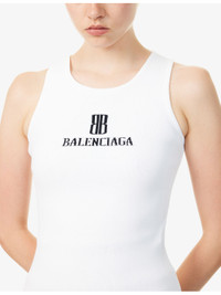 PRODUCT DETAILS - Balenciaga knit top - 84% viscose, 16% polyester - Regular fit, scoop neck, sleeveless, woven logo at chest - Dry clean - Made in Italy - True to size - Model is 5ft 10in/1.78m and wears a size small - Lightweight, slight stretch Ref: R04498083