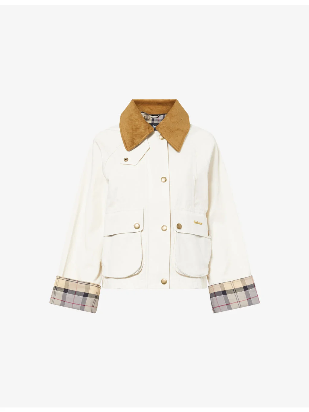 PRODUCT DETAILS - Barbour cotton jacket - 100% cotton - Zip fastening - Boxy cropped fit, detachable corduroy collar, storm flap, long raglan sleeves, turn-up cuffs, covered placket, logo embroidered popper-fastened flap pockets at front, popper-fastened vents at beck, tartan lining, branded hardware - Machine wash at 30°C - True to size - Size UK 8: length 23in / 58.5cm - Model is 5ft 10in/1.78m and wears a size UK 8 - Midweight, non-stretch Ref: R04587658