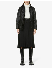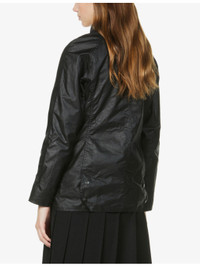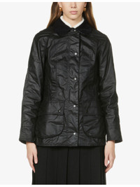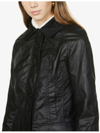 PRODUCT DETAILS - Barbour waxed-cotton jacket - 100% cotton; body lining 100% cotton; sleeve lining 100% polyester; trims 100% cotton - Exposed popper fastenings at front - Collar, corduroy trim at collar, long sleeves, two welt pockets at front, two buttoned flap pockets at front, embroidered branding at front, internal zip pockets, fully lined, tartan-check pattern at interior - Sponge clean - True to size - Size UK 8: length 29in / 74cm - Model is 5ft 10in/1.78m and wears a size UK 8 - Heavyweight, non-stretch Ref: R03897695