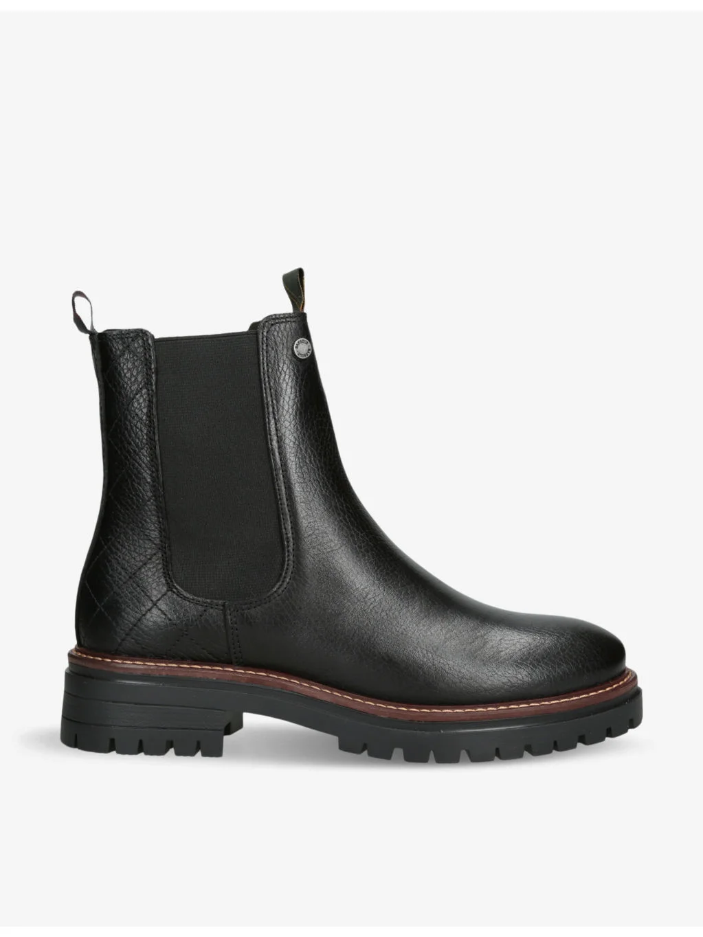PRODUCT DETAILS - Barbour leather boots - 100% leather - Slips on - Round closed toe, tartan-pattern double pull-tabs at back, branded hardware at side, diamond-quilt stitching at heel, elasticated panels - Wipe with a clean, dry cloth - Upper: leather - Lining: synthetic - Sole: rubber Ref: R04357928
