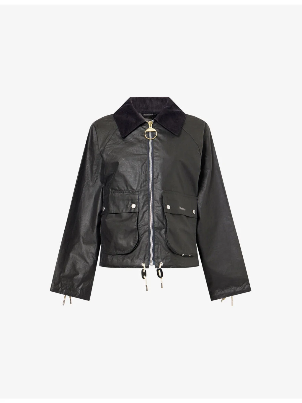 PRODUCT DETAILS - Barbour waxed-cotton jacket - 100% waxed cotton - Exposed zip fastening at front - Relaxed fit, pointed corduroy collar, oversized ring zipper, long sleeves, two front flap press-stud pockets, drawstring cuffs and hem, silver-toned branded hardware, tartan lining, waxed finish - Sponge clean - True to size - Size UK 8: length 22.5in / 57cm - Model is 5ft 10in/1.78m and wears a size UK 8 - Midweight, non-stretch Ref: R04587651