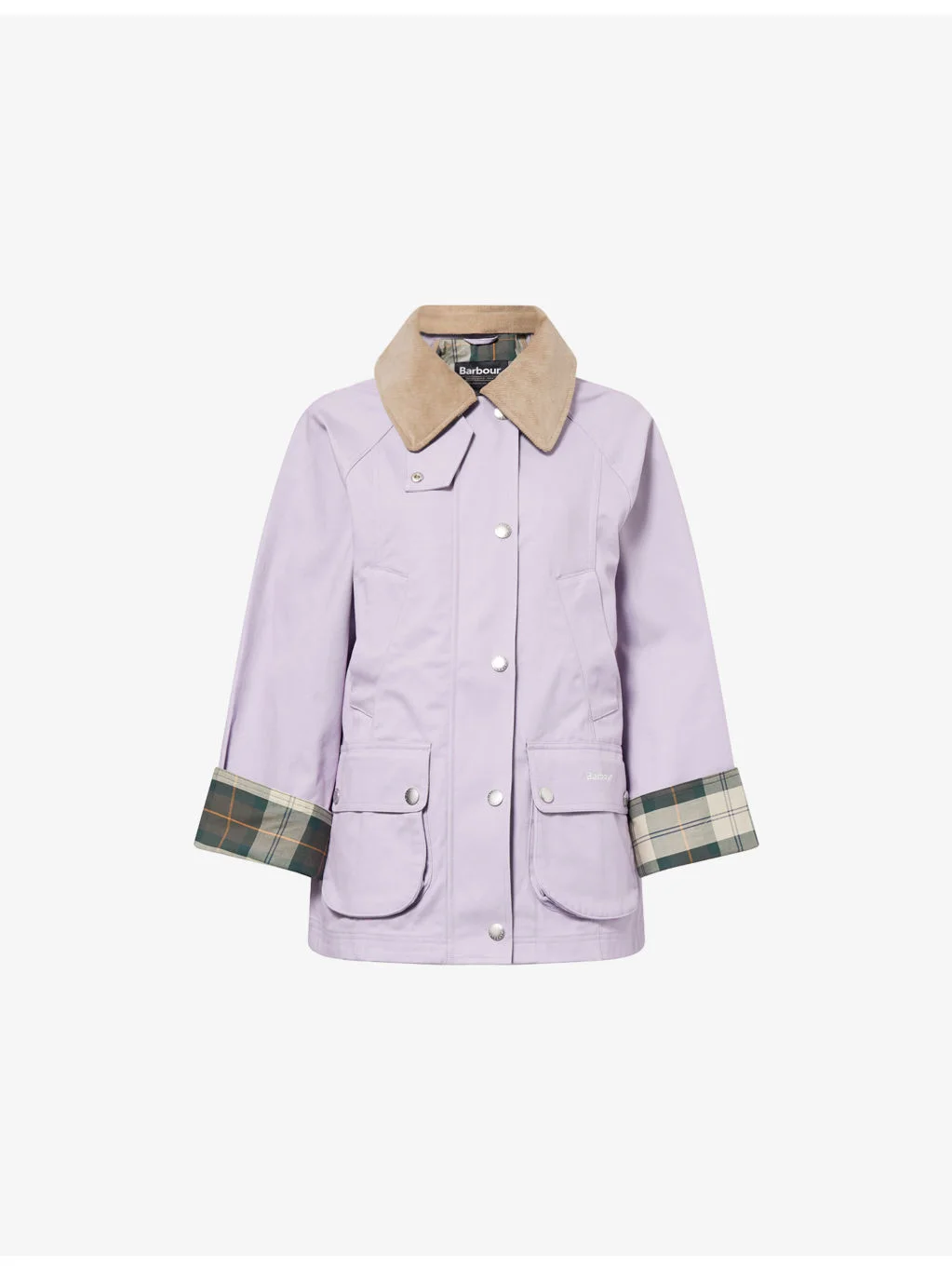 PRODUCT DETAILS - Barbour cotton jacket - 100% cotton - Zip fastening - Regular fit, detachable corduroy collar, storm flap, long raglan sleeves, turn-up cuffs, covered placket, welt pockets and logo-embroidered popper-fastened flap pockets at front, popper-fastened vents at beck, tartan lining, branded hardware - Machine wash at 30°C - True to size - Size UK 8: length 23in / 58.5cm - Model is 5ft 10in/1.78m and wears a size UK 8 - Midweight, non-stretch Ref: R04587656