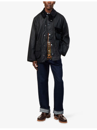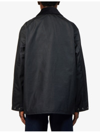 PRODUCT DETAILS - Barbour waxed-cotton jacket - 100% waxed cotton; trims 83% cotton, 15% polyester, 2% elastane - Popper fastening at front - Relaxed fit, corduroy collar, detachable drawstring hood, raglan long sleeves, buttoned cuffs, three buttoned pockets and brand embroidery at front, fully lined - Sponge clean - Size medium: length 28in / 72cm, chest 46in / 117cm - Model is 6ft 2in/1.88m and wears a size medium - Midweight, non-stretch Ref: R04492529
