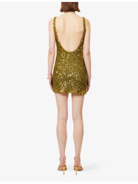 PRODUCT DETAILS - Bec + Bridge woven mini dress - 95% polyester, 5% elastane; lining 94% nylon, 6% elastane - Concealed zip fastening - Regular fit, straight neckline, sleeveless, low open back, draped design, all-over sequin design, lined - Dry clean - True to size - Size UK 8: length 32in / 81cm - Model is 5ft 10in/1.78m and wears a size UK 8 - Lightweight, slight stretch Ref: R04585906