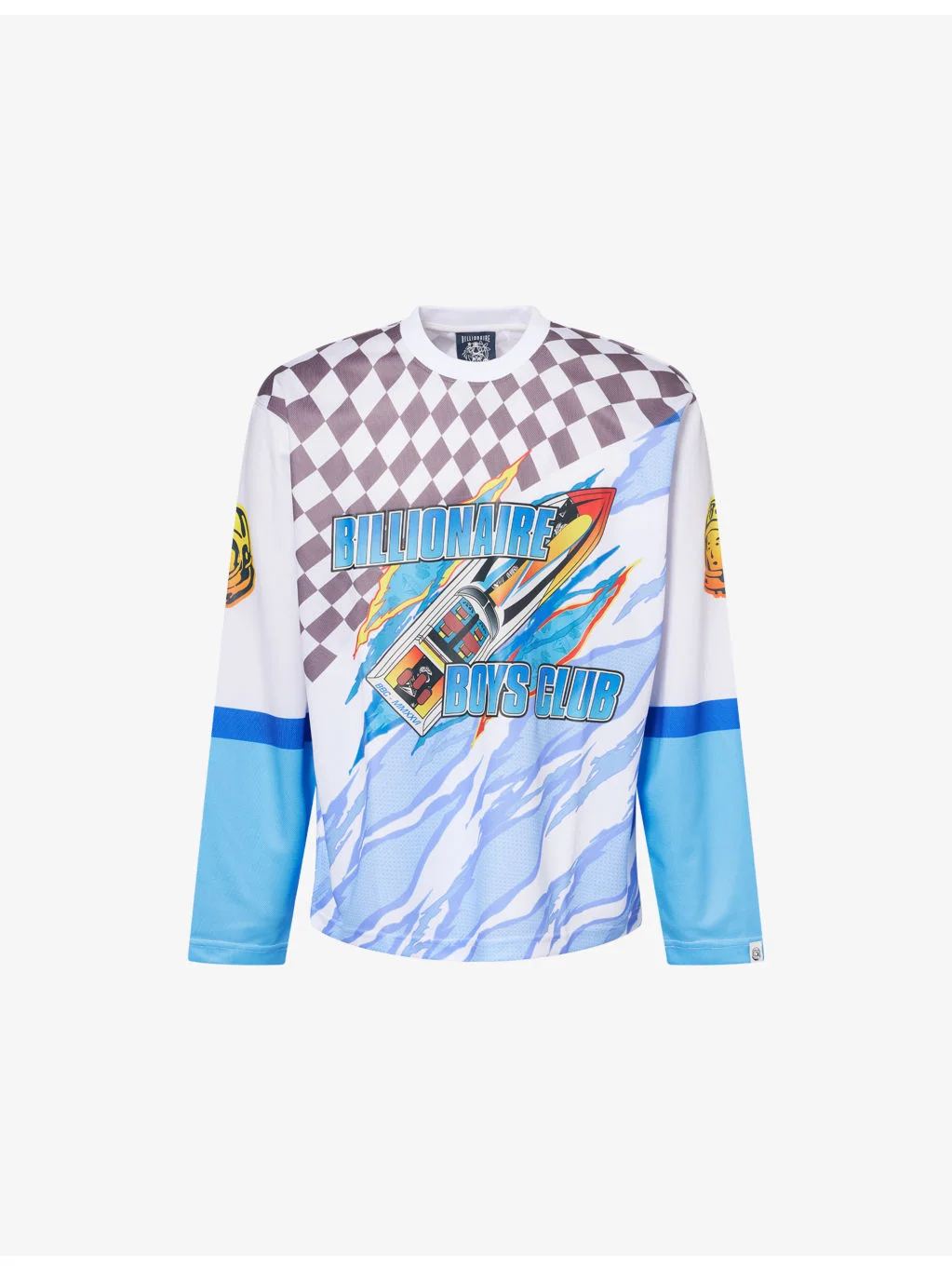 PRODUCT DETAILS - Billionaire Boys Club cotton top - 100% cotton - Relaxed fit, ribbed crewneck, astronaut print at long sleeves, brand and graphic print at front, check print at front and back, textured - Machine wash at 30°C - Model is 6ft 2in/1.88m and wears a size medium - Lightweight, slight stretch Ref: R04585586