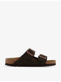PRODUCT DETAILS - Birkenstock leather sandals - 100% leather - Slips on - Round open toe, double straps at front, logo engraved buckles, cork-latex footbed, raised-jagged sole, metal hardware - Specialist leather clean - Made in Germany - Upper: 100% leather - Lining: 100% suede - Sole: 100% EVA foam Ref: R04203672