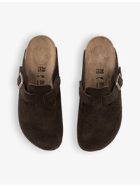 PRODUCT DETAILS - Birkenstock leather clogs - 100% suede - Slips on - Round closed toe, open back, buckle strap at front, branded hardware, signature moulded EVA sole, embossed logo at side - Specialist leather clean - Upper: 100% leather - Lining: 100% leather - Sole: 100% cork Ref: R04298259