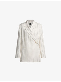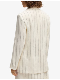 PRODUCT DETAILS - BOSS linen-blend jacket - 66% linen, 31% viscose, 2% elastane, 1% polyester - Concealed button fastening - Relaxed fit, notched lapels, long sleeves, wrap-over front, stripe print, welt pocket at front, lined - Dry clean only - Midweight, non-stretch Ref: R04359759