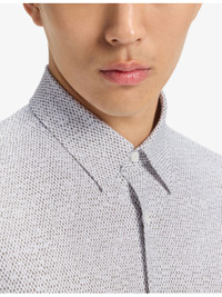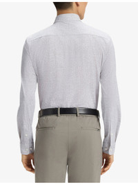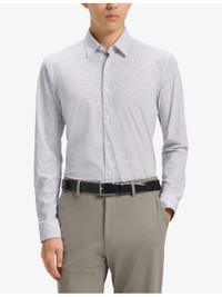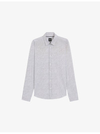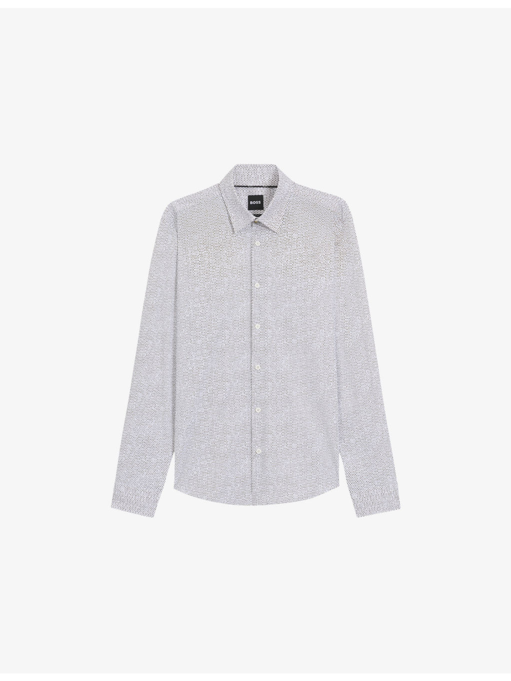 PRODUCT DETAILS - BOSS stretch-woven shirt - 76% polyamide, 24% elastane - Exposed button fastening at front - Regular fit, Kent collar, long sleeves, rounded cuffs, all-over graphic print - Machine wash at 30°C - Model is 6ft 2in/1.87m and wears a size 38 - Lightweight, stretchy Ref: R04488126