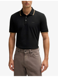 PRODUCT DETAILS - BOSS cotton polo - 100% cotton - Exposed button fastening at front - Regular fit, polo collar, logo print at the chest, short sleeves, striped trims - Machine wash at 30°C - Model is 6ft 2in/1.88m and wears a size medium - Lightweight, non-stretch Ref: R04488587