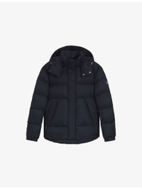 PRODUCT DETAILS - BOSS puffer coat - 100% polyamide - Exposed zip fastening at front - Regular fit, hooded, funnel neck, long sleeves, logo patch, all-over monogram pattern, two pockets at the side - Dry clean - Model is 6ft 2in/1.88m and wears a size medium - Midweight, non-stretch Ref: R04512366