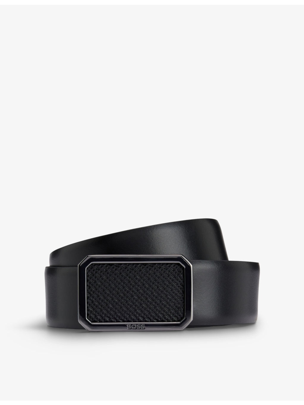 PRODUCT DETAILS - BOSS leather belt - 100% leather - Buckle fastening - Monogram plaque buckle, five holes, all-over smooth leather, polished gunmetal hardware - Dimensions: Width 3.5cm Ref: R04101183