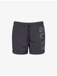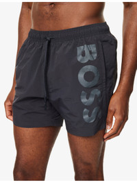 PRODUCT DETAILS - BOSS swim shorts - 100% polyamide - Elasticated drawstring waist, brand logo print at front, two welt pockets at front, one welt pocket at back with striped pull tab, mesh lined - Machine wash at 30°C - Model is 6ft 2in/1.88m and wears a size medium - Lightweight, non-stretch Ref: R04500923