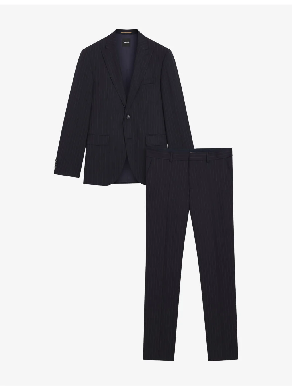 PRODUCT DETAILS - BOSS wool suit - 100% wool - Button fastening - Blazer: regular fit, peak lapels, single-breasted, long sleeves, buttoned cuffs, chest pocket, side pockets, all-over pinstriped pattern - Trousers: regular fit, mid-rise, tapered leg, side pockets, all-over pinstriped pattern - Dry clean - True to size - Midweight, non-stretch Ref: R04562674