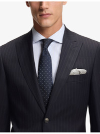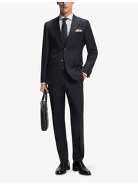 PRODUCT DETAILS - BOSS wool suit - 100% wool - Button fastening - Blazer: regular fit, peak lapels, single-breasted, long sleeves, buttoned cuffs, chest pocket, side pockets, all-over pinstriped pattern - Trousers: regular fit, mid-rise, tapered leg, side pockets, all-over pinstriped pattern - Dry clean - True to size - Midweight, non-stretch Ref: R04562674