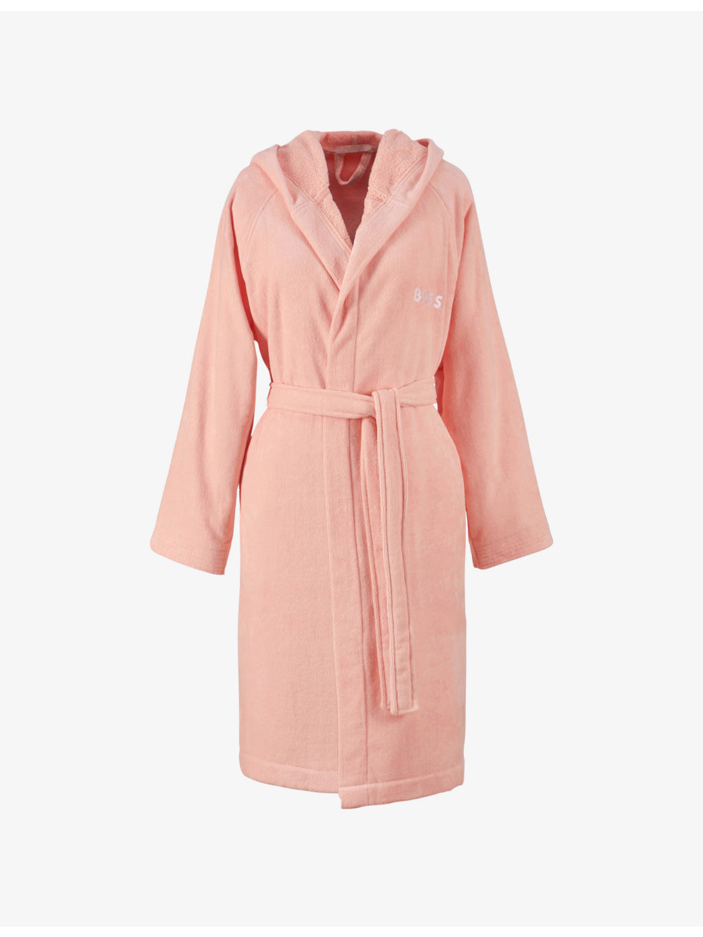 PRODUCT DETAILS - BOSS cotton-velvet bathrobe - 100% cotton - Self-tie fastening - Long sleeves, V neck, hooded design, contrasting logo embroidery at chest, velvet finish, tied waist, matching tie belt, striped embroidery at cuffs - Machine wash mild