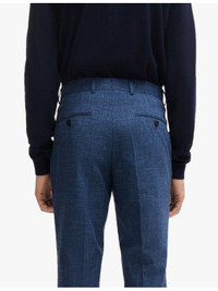 PRODUCT DETAILS - BOSS stretch wool-blend suit - 48% virgin wool, 40% cotton, 10% linen, 2% elastane - Exposed button fastening at front - Blazer: regular fit, lapel collar, long sleeves, two pockets at the side, single breasted - Trousers: regular fit, mid-rise, two pockets at the side, straight leg - Dry clean - Model is 6ft 2in/1.88m and wears a size UK 32 - Midweight, slight stretch Ref: R04252653