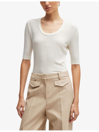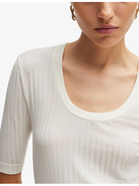 PRODUCT DETAILS - BOSS stretch-jersey top - 96% lyocell, 4% elastane - Slips on - Slim fit, scoop neck, short sleeves, all-over rib - Machine wash mild - True to size - Model is 5ft 10in/1.78m and wears a size small - Lightweight, slight stretch Ref: R04250120