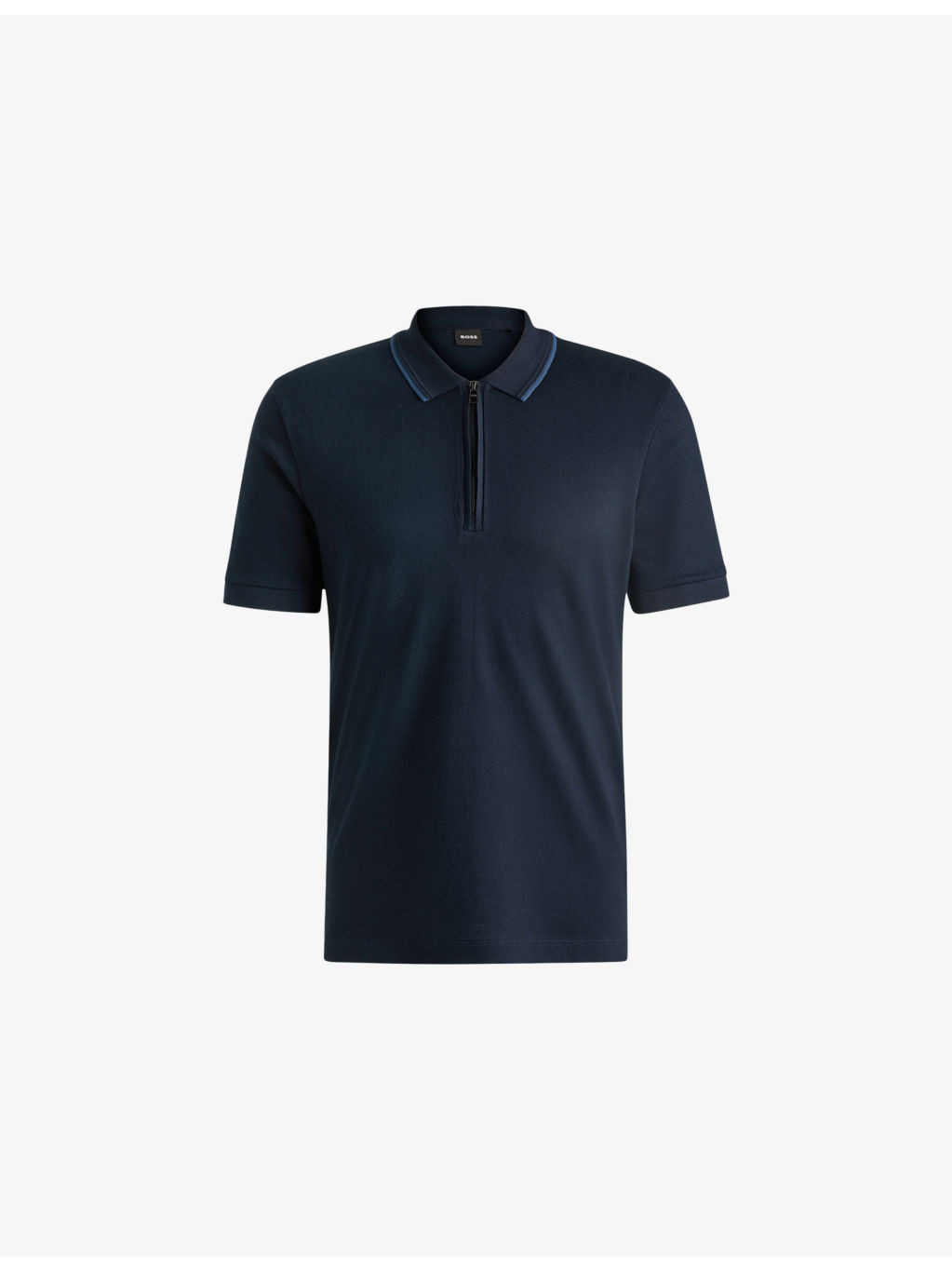 PRODUCT DETAILS - BOSS cotton polo shirt - 100% cotton - Zip fastening - Regular fit, collar, short sleeves, contrast trim, woven textured finish - Dry clean - True to size - Lightweight, non-stretch Ref: R04330900