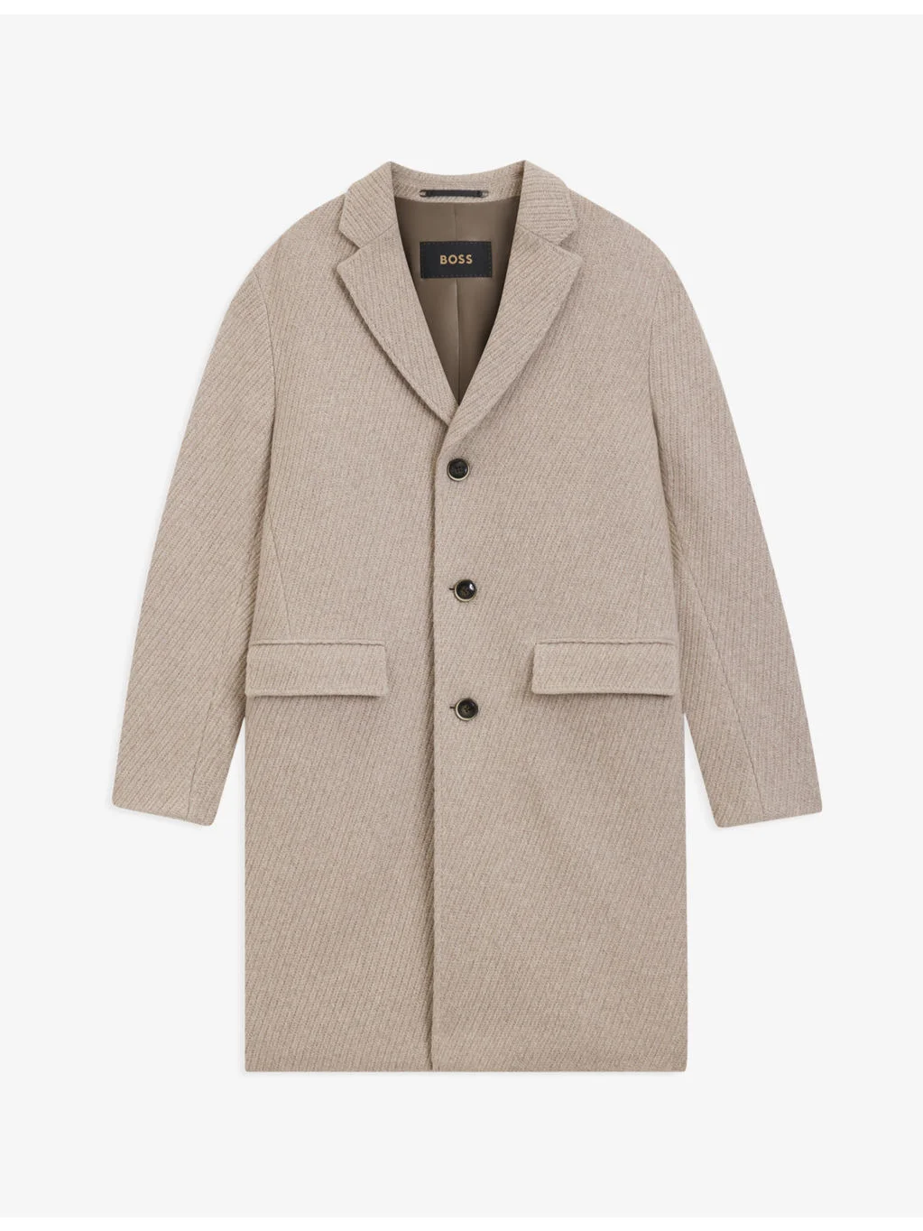 PRODUCT DETAILS - BOSS cashmere and wool coat - 97% cashmere, 3% wool - Button fastening - Relaxed fit, notch lapels, single-breasted, long sleeves, side pockets, knitted finish - Dry clean - True to size - Model is 6ft 2in/1.88m and wears a size UK 40 - Heavyweight, non-stretch Ref: R04489446