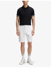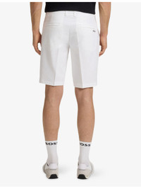 PRODUCT DETAILS - BOSS stretch-woven shorts - 95% polyester, 5% elastane - Exposed button and concealed zip-fly fastening at front - Slim fit, mid rise, elasticated waistband, concealed drawcord, belt loops, straight leg, pressed centre creases, two side pockets, two welt pockets at back, brand patch at back, water-repellent fabric - Machine wash at 30°C - Lightweight, slight stretch Ref: R04487823
