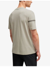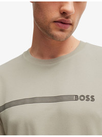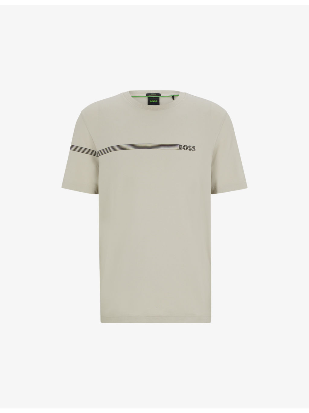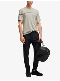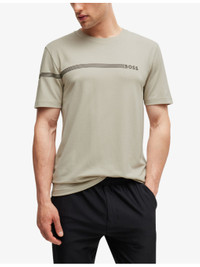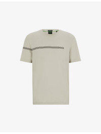 PRODUCT DETAILS - BOSS stretch cotton-blend T-shirt - 62% cotton, 32% polyester. 6% elastane - Pulls on - Regular fit, crewneck, short sleeves, stripe and logo print at front - Machine wash mild - Model is 6ft 2in/1.88m and wears a size medium - Lightweight, slight stretch Ref: R04253046