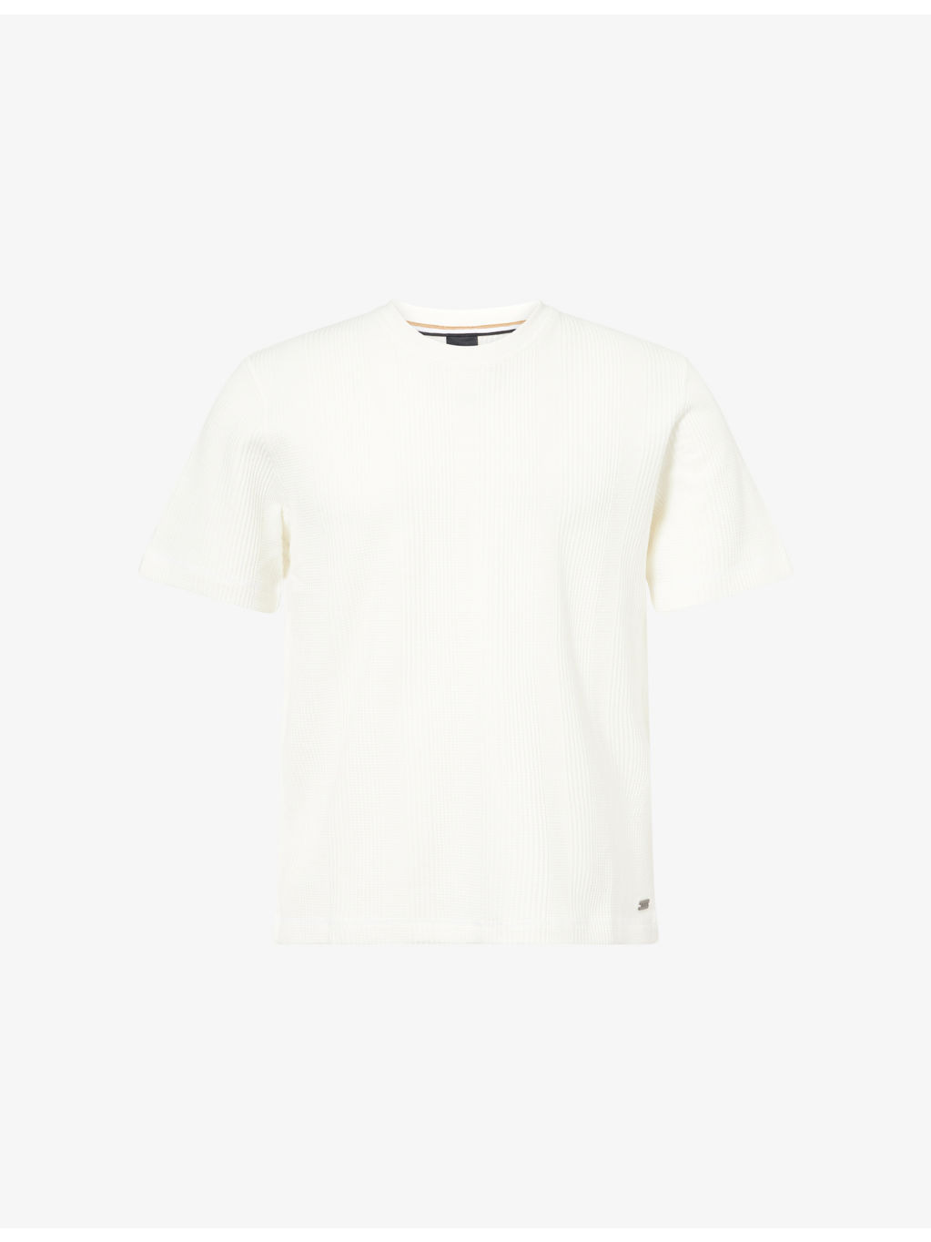 PRODUCT DETAILS - BOSS cotton-blend T-shirt - 60% cotton, 40% polyester - Relaxed fit, ribbed crewneck, short sleeves, brand plaque at front, all-over waffle texture, all-over knitted - Machine wash at 40°C - Model is 6ft 2in/1.88m and wears a size medium - Midweight, stretchy Ref: R04454537