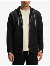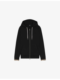 PRODUCT DETAILS - BOSS cotton-jersey hoody - 78% cotton, 18% polyester, 4% elastane - Zip fastening - Regular fit, drawstring hood, patterned drawcord, long sleeves, stripe ribbed trims - Machine wash cold - Model is 6ft 2in/1.88m and wears a size medium - Midweight, slight stretch Ref: R04488020