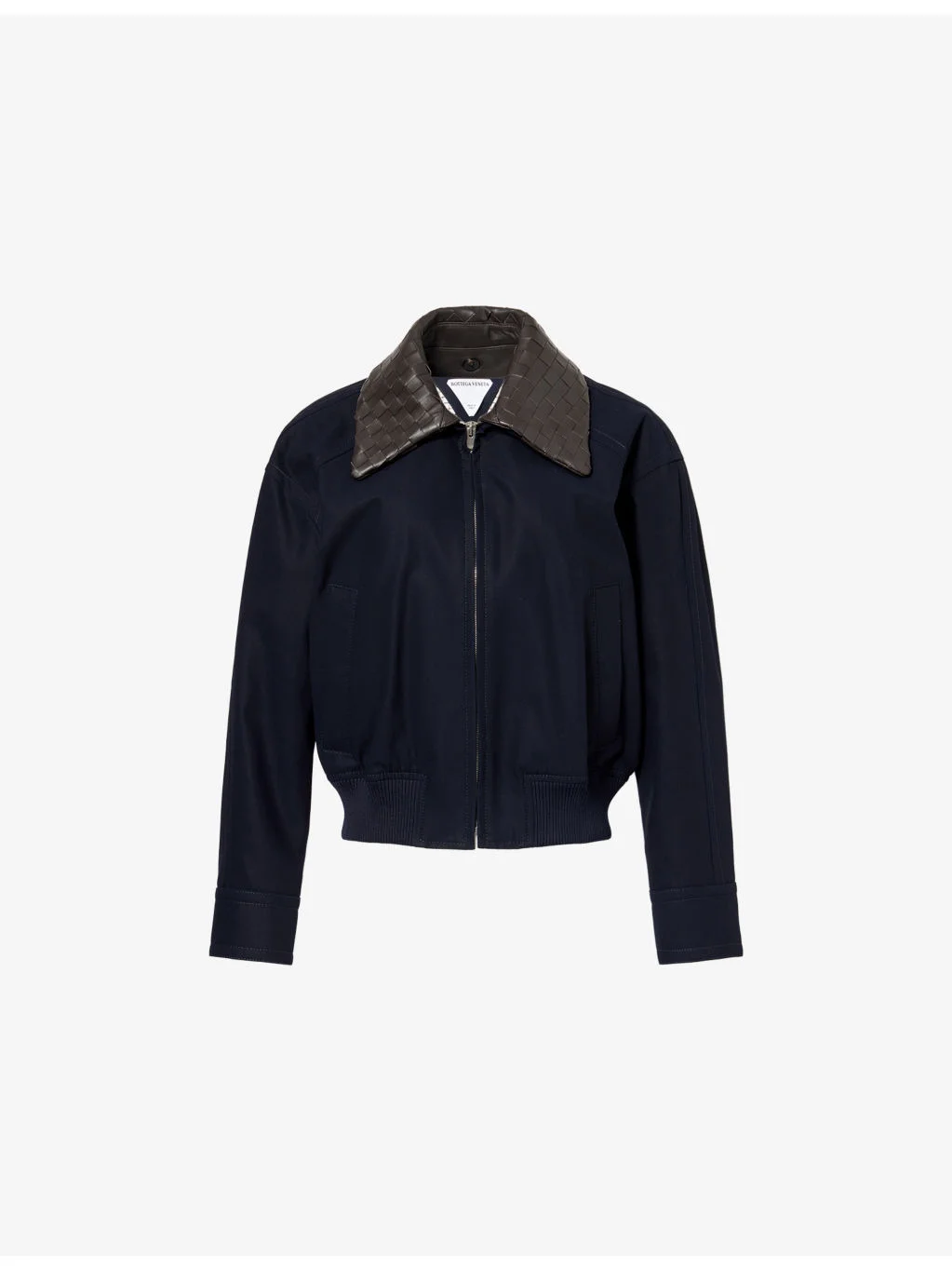 PRODUCT DETAILS - Bottega Veneta cotton jacket - 100% cotton - Concealed zip fastening at front - Regular fit, detachable intrecciato leather collar, long sleeves, buttoned cuffs, welt pockets at front - Dry clean - Made in Italy - True to size - Size UK 8: length 20in / 51cm - Model is 5ft 10in/1.78m and wears a size UK 8 - Midweight, non-stretch Ref: R04548731