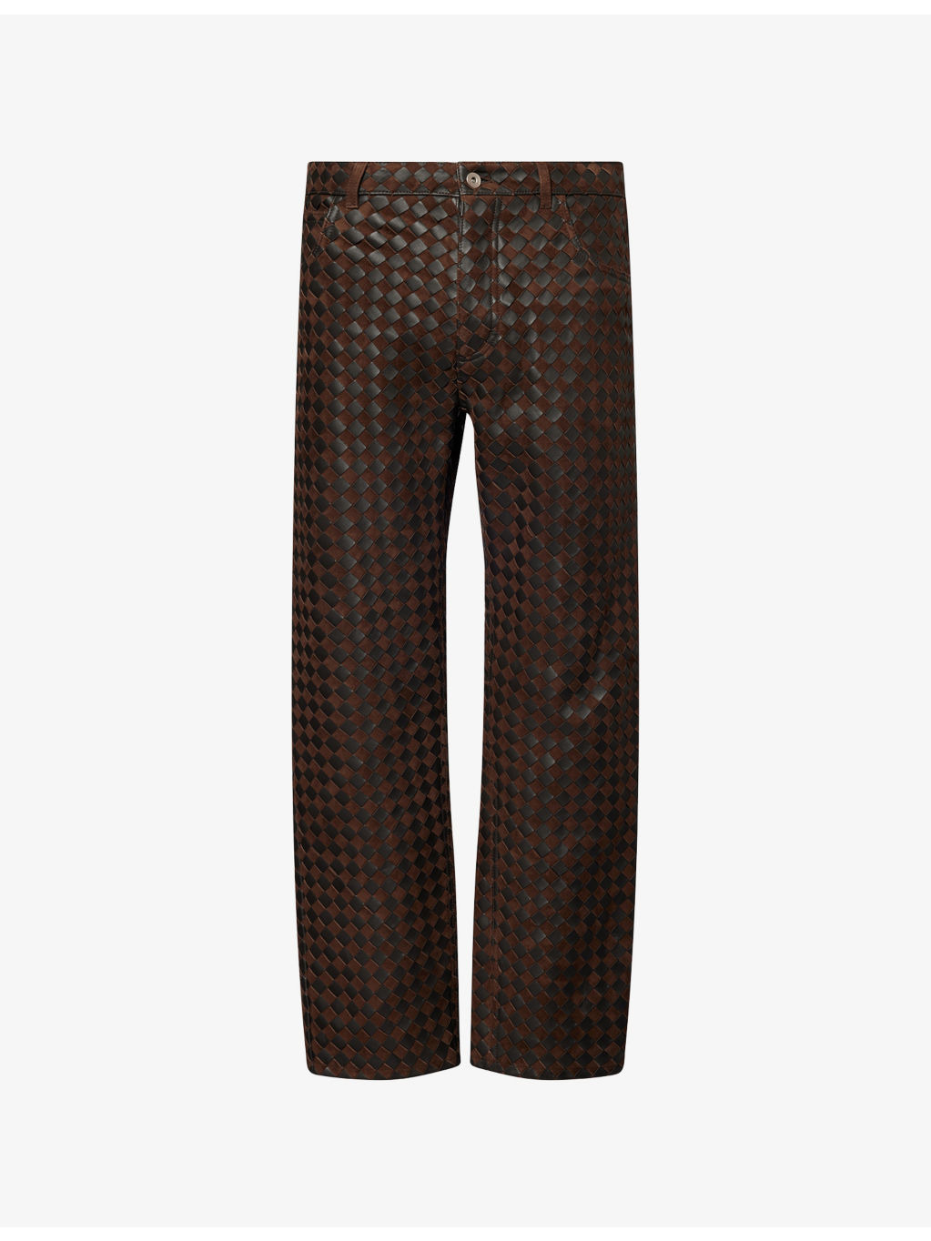 PRODUCT DETAILS - Bottega Veneta leather trousers - 100% leather - Button and button-fly fastenings at front - Regular fit, mid-rise, straight leg, belt loops, five pockets, all-over intrecciato weave - Specialist leather clean - Made in Italy - Size UK 32: rise 12.5in / 32cm, inside leg 31.5in / 80cm, leg opening 17in / 43cm - Model is 6ft 2in/1.88m and wears a size UK 32 - Midweight, non-stretch Ref: R04462286