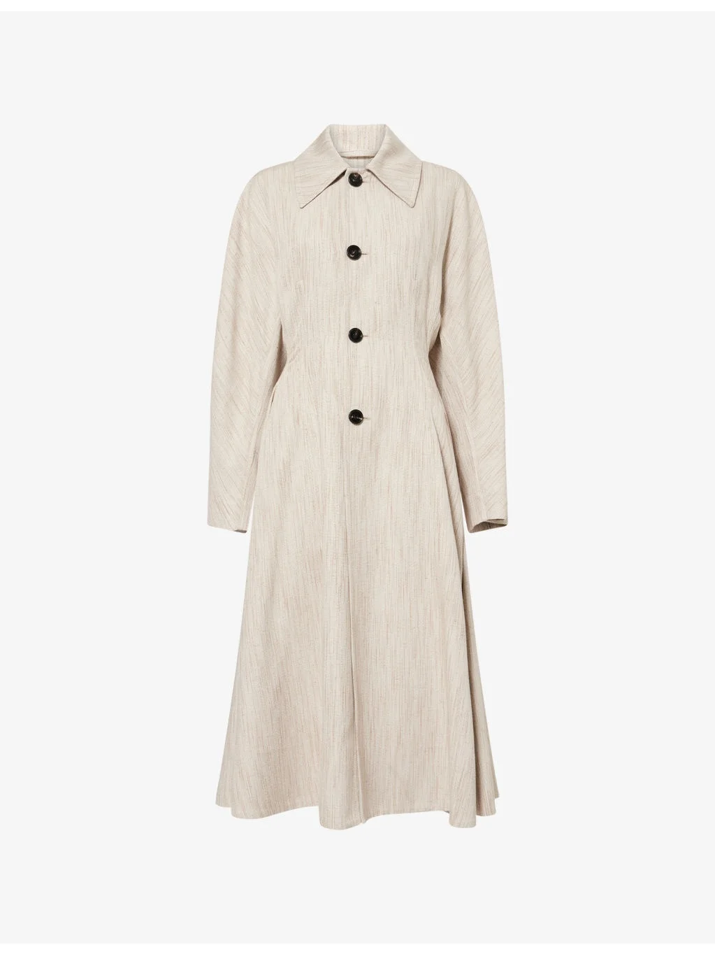 PRODUCT DETAILS - Bottega Veneta viscose-silk coat - 56% viscose, 36% polyester, 8% silk - Button fastening - Regular fit, spread collar, long sleeves, pockets at front, textured weave, longline, lined - Dry clean only - True to size - Size UK 8: length 46in / 117cm - Model is 5ft 10in/1.78m and wears a size UK 8 - Midweight, non-stretch Ref: R04462023