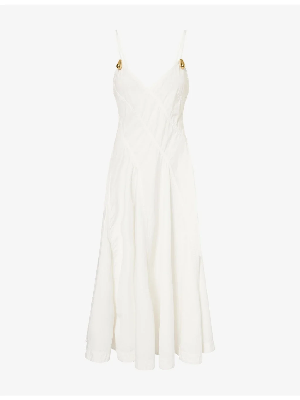 PRODUCT DETAILS - Bottega Veneta cotton midi dress - 72% cotton, 20% viscose, 8% polyester - Concealed zip fastening - Regular fit, V-neckline, sleeveless, adjustable straps, metal drop hardware, panelled construction, flared hem - Dry clean - Made in Italy - True to size - Size UK 8: length 52in / 132cm - Model is 5ft 10in/1.78m and wears a size UK 8 - Lightweight, non-stretch Ref: R04462016