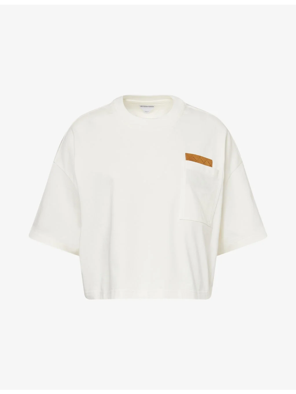 PRODUCT DETAILS - Bottega Veneta cotton-jersey T-shirt - 100% cotton; embroidery 100% polyester; trims 97% cotton, 3% elastane - Regular fit, round neck, ribbed trim at neck, dropped shoulders, short sleeves, one chest patch pocket, Intrecciato suede patch at chest, cropped, jersey texture - Hand wash - Made in Italy - True to size - Model is 5ft 10in/1.78m and wears a size small - Lightweight, non-stretch Ref: R04462045