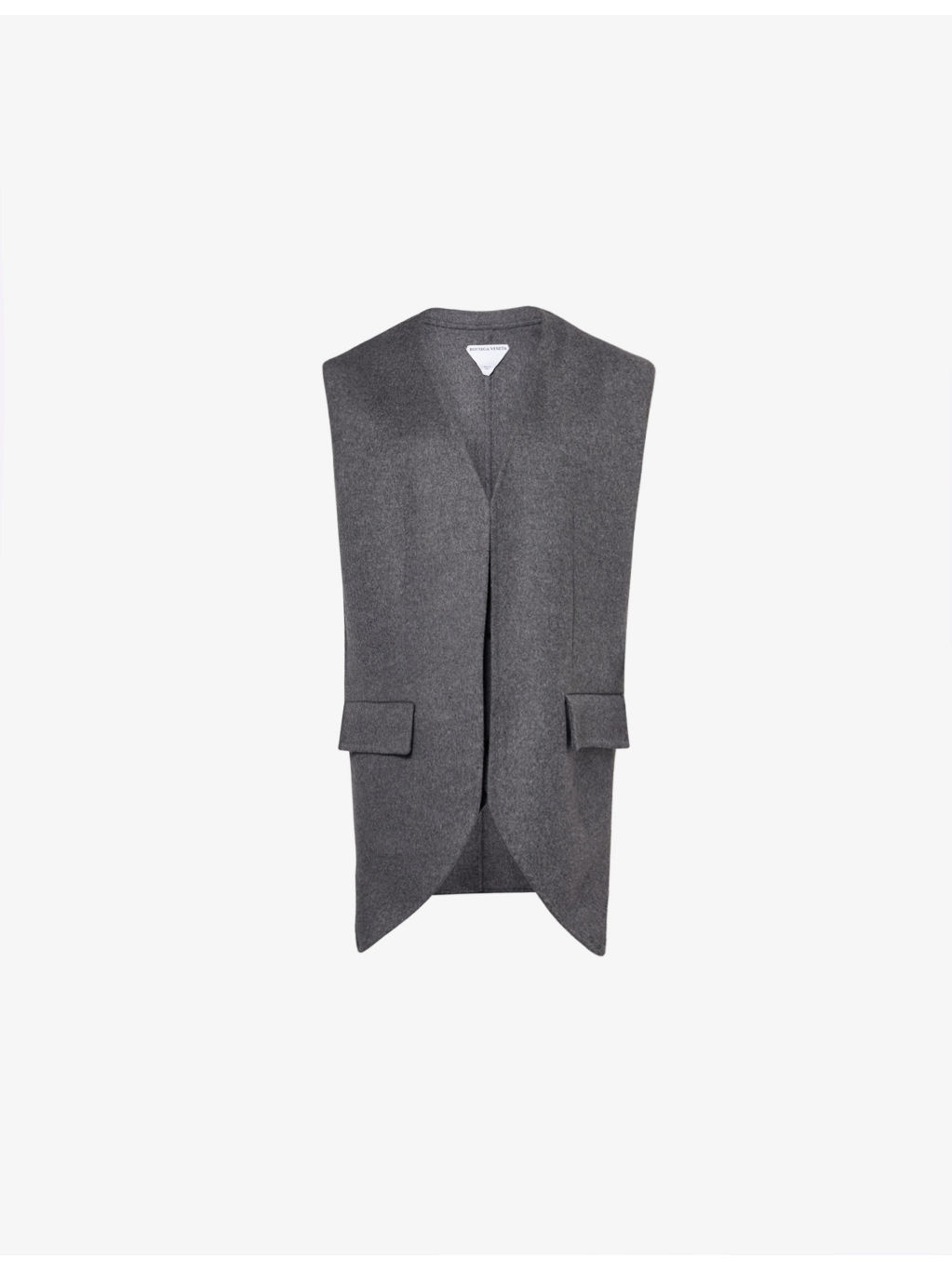PRODUCT DETAILS - Bottega Veneta wool gilet - 100% wool; pocketlining 100% cotton - Open front - Regular fit, V-neck, sleeveless, belt loops, buckled strap at rear, layered construction, two front flap pockets, textured finish - Dry clean - Made in Italy - True to size - Size UK 8: length 27in / 68.5cm - Model is 5ft 10in/1.78m and wears a size UK 8 - Midweight, non-stretch Ref: R04462026
