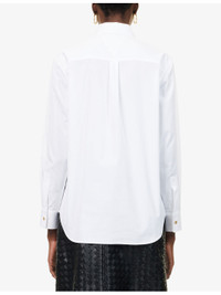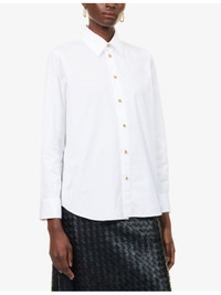 PRODUCT DETAILS - Bottega Veneta cotton shirt - 100% cotton - Exposed button fastenings at front - Regular fit, pointed collar, long sleeves, buttoned cuffs, gold-toned knot buttons, curved hem - Dry clean - Made in Italy - True to size - Size UK 8: length 28.5in / 72.5cm - Model is 5ft 10in/1.78m and wears a size UK 8 - Lightweight, non-stretch Ref: R04508477