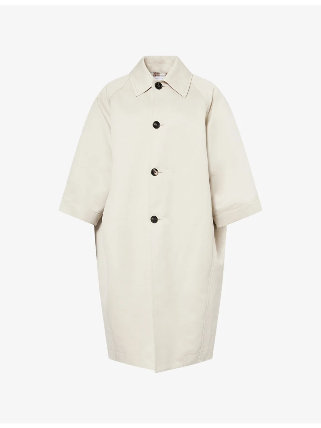 PRODUCT DETAILS - Bottega Veneta cotton and silk coat - 57% cotton, 43% silk; lining 100% cotton; pocketlining 100% cotton - Exposed button fastening at front - Relaxed fit, spread collar, raglan three-quarter sleeves, two slip pockets at front, all-over twill texture, fully lined - Dry clean - Made in Italy - True to size - Size UK 8: length 41in / 105cm - Model is 5ft 10in/1.78m and wears a size UK 8 - Midweight, slight stretch Ref: R04462024
